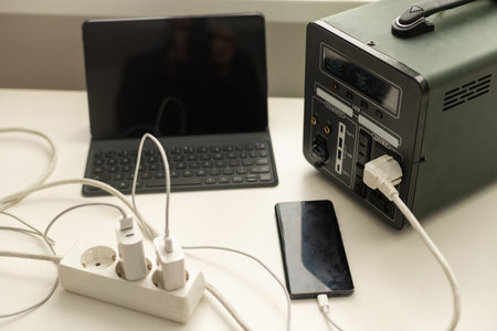 Portable Power Station is charging gadgets. Modern, information technology. Control panel. close up.