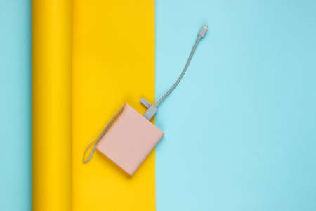 Power bank on wrapped paper background. Pastel color trend, minimalistic still life. Modern gadgets. Top view