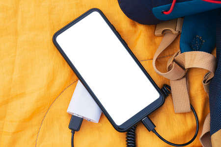 The smartphone is being charged with a portable charger. A power bank with a mockup of a white screen of a mobile phone on a sleeping bag with a backpack
