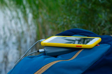 Smartphone is charged using a portable charger. Power Bank charges the phone outdoors with a backpack for tourism in the background of nature and the river