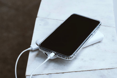 Close up of smartphone in transparent case connected to white portable charger discussed on light marble surface