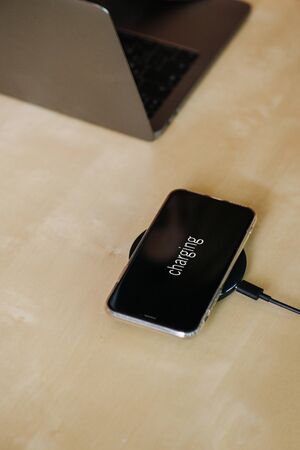 Phone on a charger pad on a table next to metal laptop. Word indicates charging in progress. Close up.