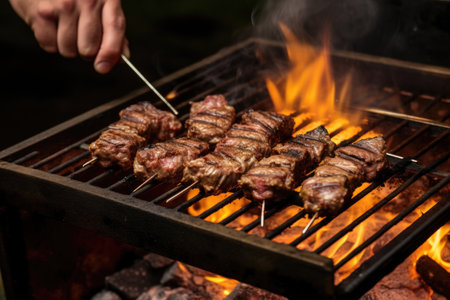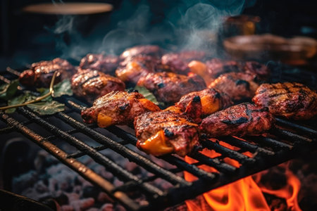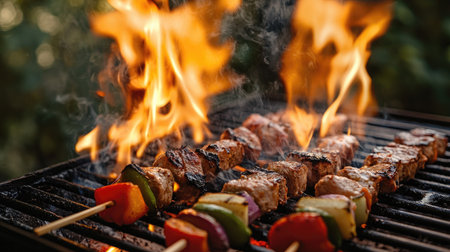 A dynamic scene of a barbecue grill in action, with flames licking up from the grill as skewered meats and vegetables cook to perfection, emphasizing the cooking process.