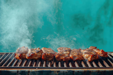 A vibrant scene of grilled meat sizzling over charcoal, surrounded by softly glowing flames. The smoke rises against a twilight background, evoking a sense of warmth and outdoor enjoyment. Perfect for showcasing culinary delights and summer gatherings.