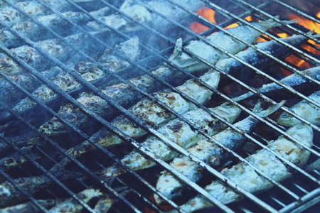 Grilled fresh sardines, roasted with charcoal. Barbecue with delicious sardines (Sardina pilchardus) roasted outdoors in Sanlucar de Guadiana, Andalusia, Spain.