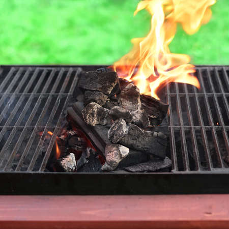 Flaming charcoal in BBQ appliance. Lawn in the background.