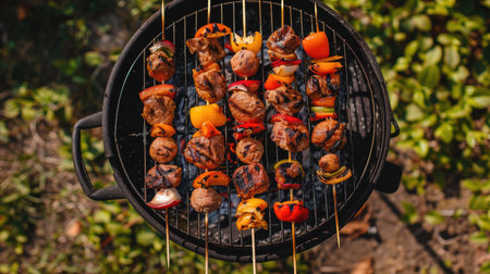 Enjoy a vibrant display of grilled skewers featuring juicy meat and fresh vegetables. Perfect for summer gatherings and outdoor cooking adventures.