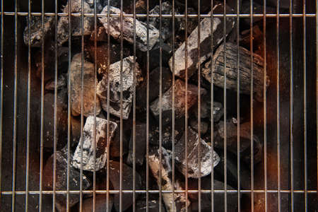 Glowing charcoal and grill grate are for cooking at temperature. Closeup. Frontview. Dirty grill after cooking. View from the front