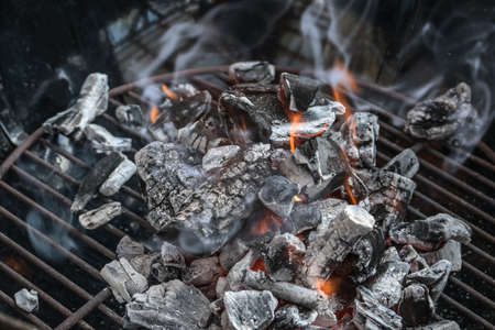Glowing wood charcoal with small flames and smoke in a black grill, preparation for a barbecue, copy space, selected focus, narrow depth of field
