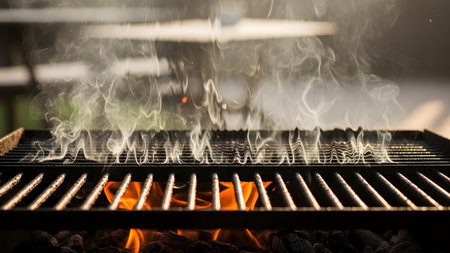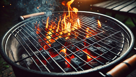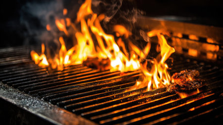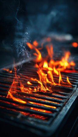 A detailed macro shot of a grill with intense flames and smoke rising, capturing the dramatic ambiance of a nighttime barbecue with strong contrast lighting and cinematic realism.
