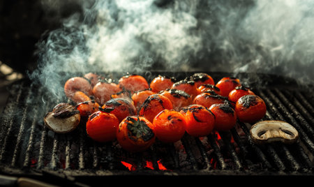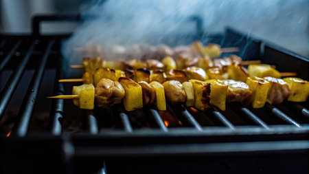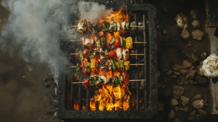 Vibrant grilled skewers featuring colorful vegetables and succulent meat over a charcoal fire, exuding delicious aromas and a summer vibe perfect for outdoor gatherings.