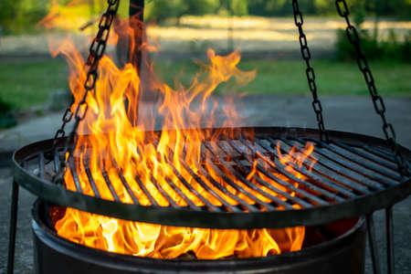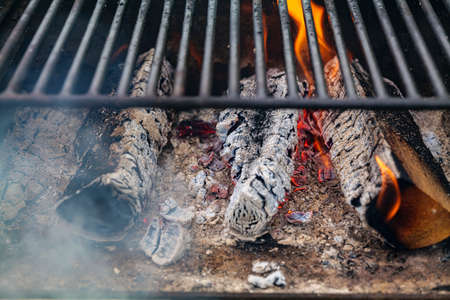Burning firewood with flame through bbq grill grates. High-quality photo