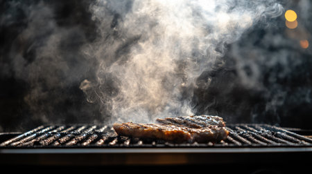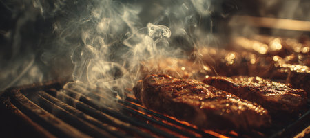 Photorealistic close-up of smoke rising from a grill, showcasing sizzling meat in warm, cinematic tones. The horizontal framing captures the essence of outdoor cooking.