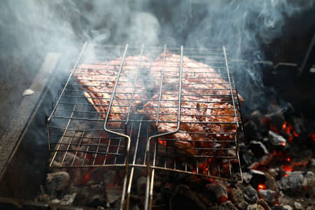 Grilling meat on an open flame with visible heat and smoke, outdoor BBQ setting