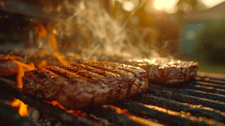 Sizzling steak on charcoal grill in backyard, enhancing outdoor cooking experience