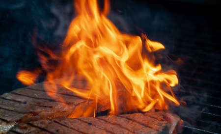 Close-up of smoke rising from a barbecue grill, with flames visible beneath the cooking grate.