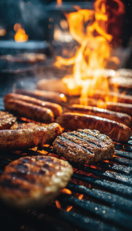 Sizzling Summer BBQ: Juicy Sausages and Burgers Grilling with Flames