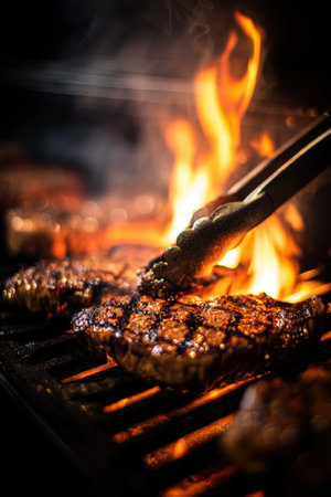 A close-up view of a juicy steak on a grill as tongs lift it, surrounded by intense flames and smoke. ideal for bbq-themed designs, culinary arts, or cooking websites that capture the essence of grilling and meat preparation.