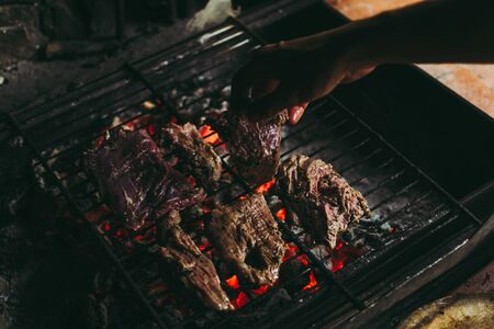 Cook grills steaks and pork ribs open fire. Turns meat over with tongs. Street food concept.
