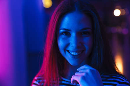 Neon close up portrait of young woman in white dress on dark blue background