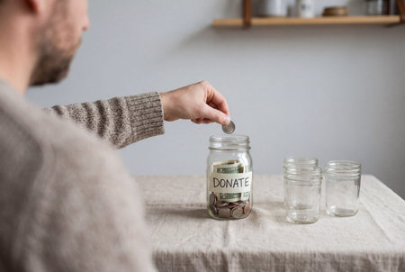 A charitable man in a beige sweater drops a silver coin into a glass jar labeled donate filled with cash and coins on a linen table next to two empty jars.