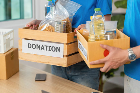 Donation Contribution. Volunteers handing over a wooden crate filled with donations at a community center.