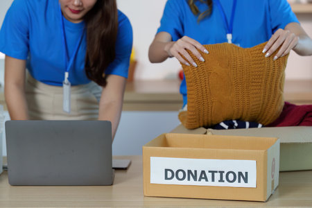 Diverse group of women volunteering together for donation drive, organizing clothes and food items in community service.