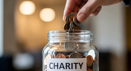 A hand drops a coin into a donation box, illustrating the concept of giving and charity. The image symbolizes generosity, support, and making a difference through financial contributions.