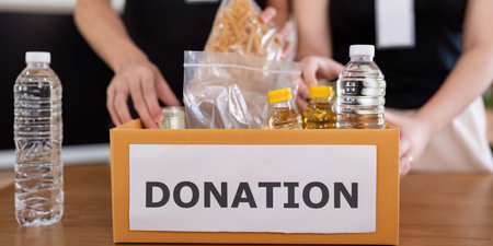 A cardboard box filled with 'donation' text, symbolizing generosity and community support, on a compassionate background