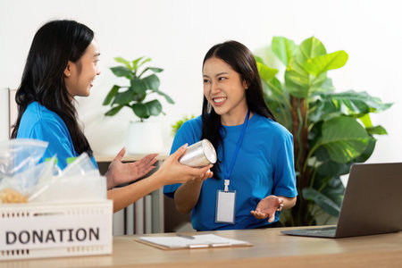 Group of volunteers working in community charity donation center., sorting out clothes and canned food.