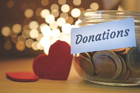 Coins in glass jar with DONATE word written text label for giving and donation concept