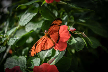 Mindo in Ecuador, a perfect spot to see some beautiful butterflies, brown and orange wings posing over a colorful flower to lick the nectar