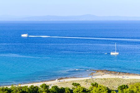 Aerial panoramic view of seascape with crystal clear azure sea and rocky shores. Yachts in a beautiful lagoon on backdrop of rocks. The concept of an ideal destination for summer travel and vacation.