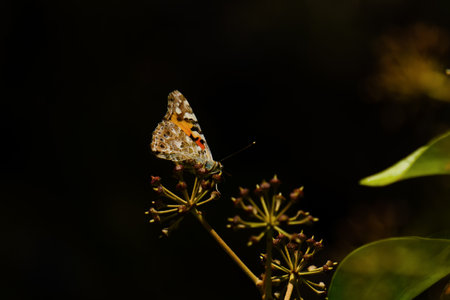 close-up of a thistle butterfly, Vanessa cardui, perched on a green leafy plant with an out of focus background