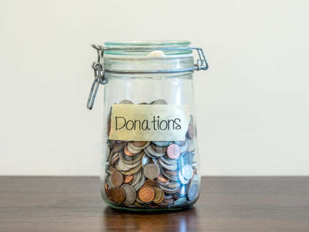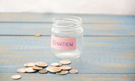 Coins in glass jar with DONATE word written text label for giving and donation concept