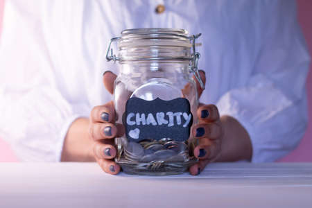 Woman hands holding a glass jar with coins with a chalk Charity tag, donation and charity concept