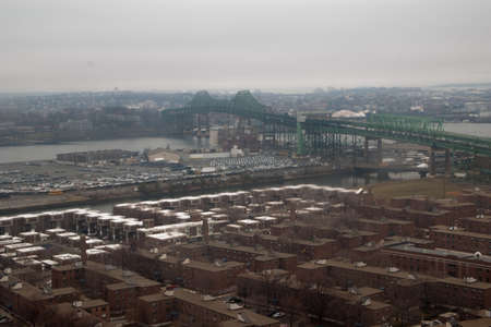 An overhead view of the Tobin Bridge and homes in the Charlestown neighborhood of Boston.
