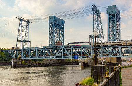 Newark, NJ - September 11, 2013: NJ Transit train crosses the Newark Drawbridge over the Passaic River in New Jersey