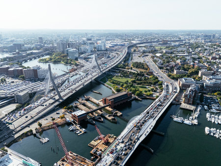 Aerial view of Boston city, bridges and river with skyline in sunlight. g.