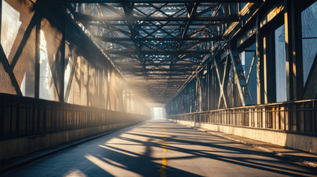 Urban road passing beneath a modern steel bridge, intricate metal framework overhead, sunlight filtering through beams for a cinematic effect.
