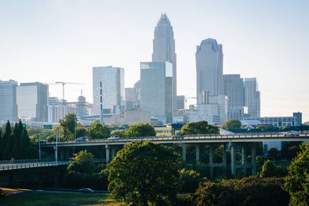 city's business and banking centers rise above the roads of Charlotte, North Carolina.