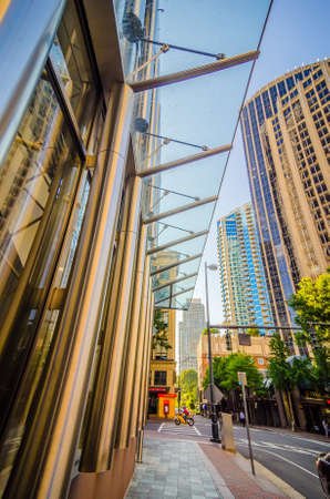 Seattle, Washington, USA - july 20, 2018 - Modern buildings on downtown of Seattle viewed from low angle