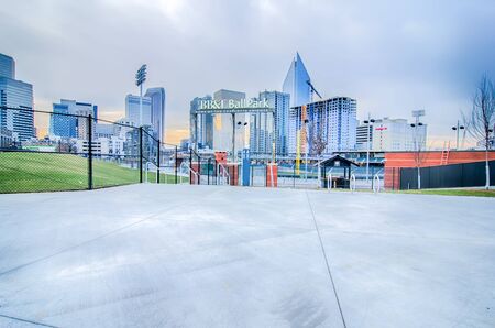 April 2017 Charlotte NC USA - BB&T baseball park sign and charlotte skyline with tilt effect in the morning