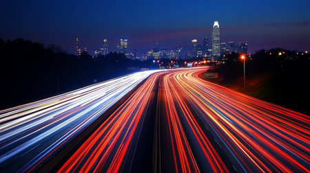 Captivating nighttime cityscape showcasing dynamic light trails of highway traffic against a vibrant urban skyline, illustrating the energy of city life.
