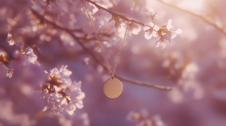 A delicate necklace pendant hangs gracefully amid blooming cherry blossom flowers, bathed in soft, warm light. This serene image captures the elegance of nature and jewelry.