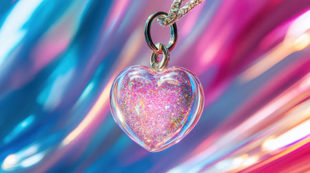 Beautiful heart-shaped pendant adorned with glitter, suspended against a vibrant background of soft, flowing waves in exquisite color tones, perfect for any romantic setting.