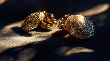 Close-up view of beautifully engraved medallions displaying detailed cultural symbols, showcasing craftsmanship. The background appears solid, enhancing the medallions' shine and beauty.