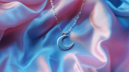 A silver crescent moon pendant necklace gracefully rests on soft, colorful fabric, blending elegance with a touch of whimsy, perfect for any fashion enthusiast.