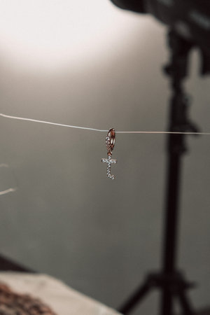 A close-up of a sparkling diamond pendant hanging from a delicate chain, with a blurred background of soft pastel colors, creating an ethereal atmosphere.