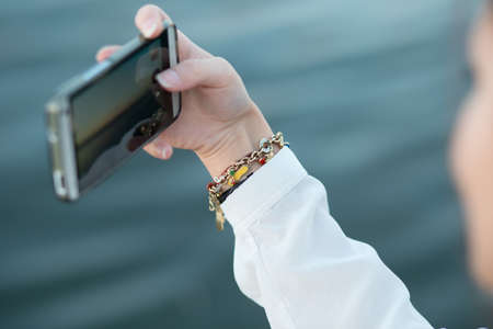 Woman with bracelets and rings taking a horizontal picture with her mobile phone. Foreground.